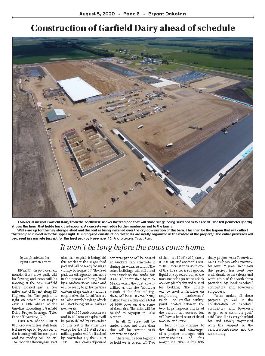 The dairy, which is located on 160 acres in Waukon Township, eight miles southeast of Gary, Minnesota, began milking June 20, 2022, 15 months after construction began on the facility.
